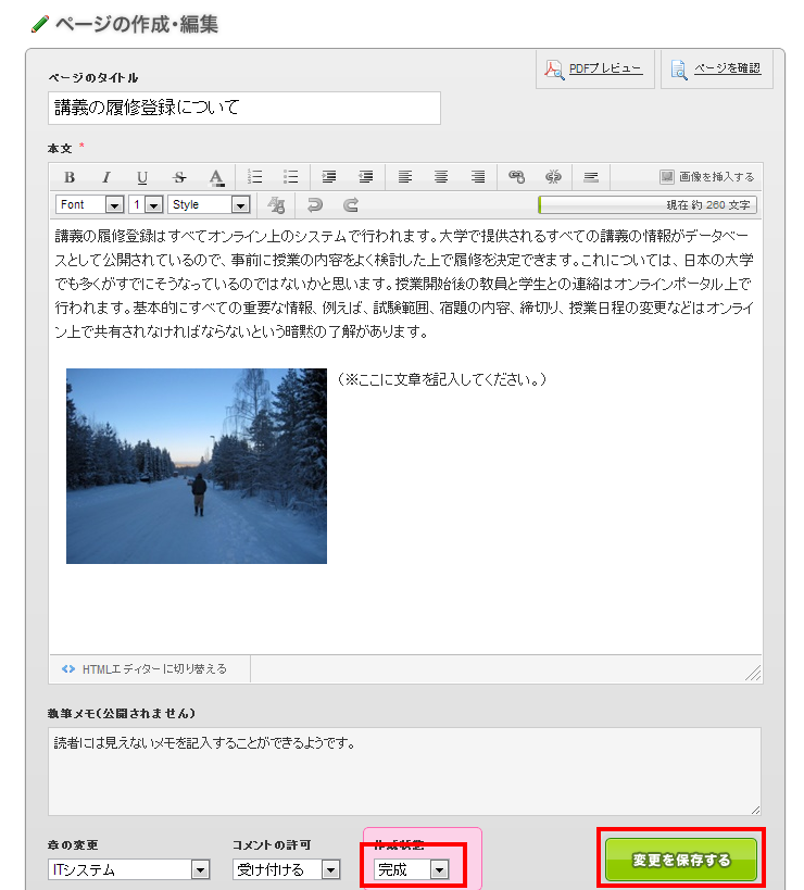 読者には見えない、自分用のメモを記入する欄もあります。また、ページの作成が完了した後には、ページの「作成状態」を「完成」にしてから保存しましょう(ページ状態が「完成」になっていないと本の公開ができません)。