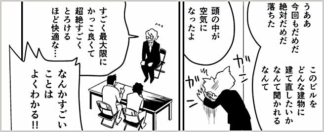 タニジマくん。彼は、うまくアピールできなかった面接試験の帰りに、エレベーターに乗り込みます。